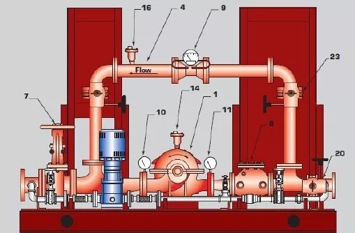 單臺消防水泵的流量不大于 20L/s、設(shè)計工作壓力不大于 0.50MPa 時,泵組應(yīng)預(yù)留 測量用流量計和壓力計接口,其他泵組宜設(shè)置泵組流量和壓力測試裝置。