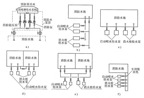 (2)高壓或臨時(shí)高壓消防給水系統(tǒng),其每臺(tái)消防泵(工作水泵和備用泵)應(yīng)有獨(dú)立的吸水管。從消防水池(或市政管網(wǎng))直接取水,保證供應(yīng)火場(chǎng)用水。